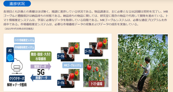 内容は、国内・国外の野菜生産で生産額トップを誇るトマト収穫を支援する次世代トマト収穫支援ゴーグルの開発。糖度・酸度・大きさの推定機能、市場価格推定による収穫時期の最適化機能をもたせるもの。支援ゴーグルが5Gネットワークに接続されることで、ゴーグルから得られる高精細画像を無圧縮でクラウドサーバにアップロードし、AIで解析後、解析結果をゴーグルへリターンさせるまでの一連動作を低遅延で実現可能。